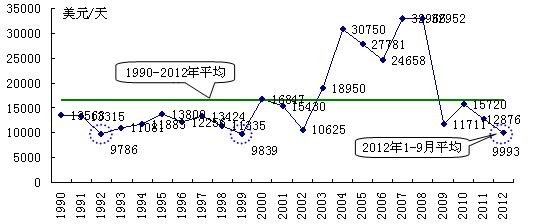 經(jīng)濟(jì)復(fù)蘇乏力或內(nèi)生動力不足直接對全球政治、軍事、民生、金融等產(chǎn)生極其不利影響,使從來沒清澈過的地球村變得更為渾濁,發(fā)展前景變得更為不確定性,對本已十分低迷的航運(yùn)市場形成新的壓力與沖擊,直接把今年國際航運(yùn)業(yè)拖入了歷史罕見的冰點(diǎn)。2012 年1-9月克拉克松航運(yùn)綜合費(fèi)率平均水平跌破1萬美元/天關(guān)口,與1992年和1999年水平相當(dāng);BDI平均點(diǎn)數(shù)下跌至907點(diǎn),創(chuàng)出1999年以來的新低。
