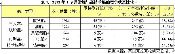 第三,與油氣勘探、開采、生產(chǎn)、運(yùn)輸環(huán)節(jié)相關(guān)船型與海工裝備市場表現(xiàn)相對活躍。不完全統(tǒng)計,2012年1-9月全球累計成交各類船舶(含海工裝備)金額約590億美元,其中,與油氣勘探、開采、生產(chǎn)、運(yùn)輸相關(guān)船舶與海工裝備等產(chǎn)品(油船、LNG船、LPG船、鉆井船、各類平臺、海工輔助船等)合計成交金額達(dá)456億美元,占總量78%,僅海工裝備成交總金額就高達(dá)355億美元,占總量比重高達(dá)60%。海工裝備市場的活躍對有效阻止船舶市場整體行情進(jìn)一步下滑起到重要的支撐作用。