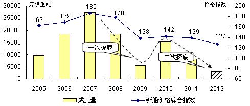 當(dāng)人們欣喜看到2010年船舶市場“強(qiáng)勁復(fù)蘇”,寄希望2011年仍能保持這種態(tài)勢的時候,2011年世界經(jīng)濟(jì)、貿(mào)易、航運(yùn)市場風(fēng)云突變,船舶市場外部環(huán)境再度發(fā)生惡化,加上隱藏于船舶市場船舶產(chǎn)業(yè)深層次矛盾與問題的不斷暴露,船舶市場重返下行通道,2012年這種情況變得更為糟糕。按克拉克松公司統(tǒng)計,2012年1-9月全球累計成交新船訂單781艘、3230萬載重噸,月均360萬載重噸,較上一年月均成交量下滑46%,甚至比2009年月均水平(上次谷底)還低25%,呈典型“二次探底”之勢。隨著成交量的持續(xù)萎縮,新船價格進(jìn)一步下滑,2012年9月底克拉克松新船價格指數(shù)報收于127點(diǎn),較上年底下跌12點(diǎn),并創(chuàng)下2008年價格下行以來的新低。