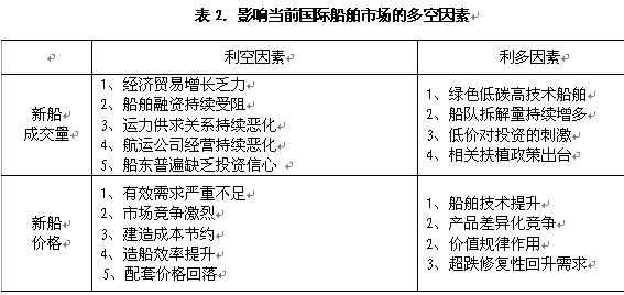 在外圍經(jīng)濟(jì)和航運(yùn)市場環(huán)境再度惡化的情況下,年初以來國際船舶市場新船成交量和價格仍舊延續(xù)上年下跌態(tài)勢,但需求結(jié)構(gòu)變化仍為行情發(fā)展提供了新的機(jī)遇與氣象。從發(fā)展態(tài)勢來看,影響市場的消極因素仍然占據(jù)主導(dǎo)地位,短期內(nèi)蕭條的行情狀態(tài)不會發(fā)生根本變化,如果航運(yùn)與造船市場能在今年完成充分觸底的話,來年行情定會出現(xiàn)修復(fù)性反彈(談不上“復(fù)蘇”),但不管市場好轉(zhuǎn)與否,滯后性決定船舶行業(yè)經(jīng)濟(jì)運(yùn)行情況可能更為糟糕。