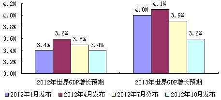2012年一季度,在世界各國聯(lián)手干預(yù)政策及短期負(fù)面因素消失的推動下,世界經(jīng)濟(jì)下滑趨勢與通脹風(fēng)險得到一定程度受控。4月份,國際貨幣基金組織甚至上調(diào)了全球經(jīng)濟(jì)增長預(yù)期。但是,進(jìn)入到二季度,因希臘與西班牙問題再度重演,歐債危機(jī)再度惡化,對世界實體經(jīng)濟(jì)產(chǎn)生了新的負(fù)面影響。歐美發(fā)達(dá)經(jīng)濟(jì)體復(fù)蘇緩慢,中、印度等大宗商品需求國經(jīng)濟(jì)增速回落超預(yù)期,再度把世界經(jīng)濟(jì)推向“二次探底”的邊緣,7月份IMF下調(diào)了全球經(jīng)濟(jì)增長預(yù)期,經(jīng)濟(jì)發(fā)展前景頓時再生變數(shù)。進(jìn)入三季度,二季度產(chǎn)生的不利因素對實際經(jīng)濟(jì)影響進(jìn)一步深化,全球經(jīng)濟(jì)體出現(xiàn)罕見的同步下滑態(tài)勢,新興經(jīng)濟(jì)體一直以來作為全球經(jīng)濟(jì)復(fù)蘇的貢獻(xiàn)者,也因外需疲軟,內(nèi)需動力減弱而呈明顯的下降趨勢,鑒于此,10月份IMF在7月份的預(yù)測基礎(chǔ)上再度下調(diào)了今明兩年經(jīng)濟(jì)增長預(yù)期。
