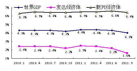 世界經(jīng)濟(jì)在經(jīng)歷2010年“脆弱而不平衡”的復(fù)蘇后,進(jìn)入2011年,這種復(fù)蘇再度遭遇挫折,形勢(shì)也變得更為復(fù)雜多變。從利比亞、敘利亞、埃及和也門為代表的中東地區(qū)政治危機(jī),到日本地震重創(chuàng)世界供應(yīng)鏈,到歐債危機(jī)不斷深化,再到標(biāo)準(zhǔn)普爾下調(diào)美債評(píng)級(jí)。一系列經(jīng)濟(jì)政治事件使得全球經(jīng)濟(jì)動(dòng)蕩不安,下行風(fēng)險(xiǎn)也不斷加大。2011年9月IMF大幅下調(diào)今明兩年全球經(jīng)濟(jì)增速預(yù)期,分別下調(diào)0.3%及0.5%,均降至4%的水平;發(fā)達(dá)經(jīng)濟(jì)體今年的經(jīng)濟(jì)增長(zhǎng)率由此前預(yù)計(jì)的2.2%下調(diào)至1.6%,2012年的增長(zhǎng)率由此前的2.6%下調(diào)至1.9%;新興及發(fā)展中經(jīng)濟(jì)體的經(jīng)濟(jì)增長(zhǎng)率由6.6%及6.4%分別下調(diào)至6.4%和6.1%。