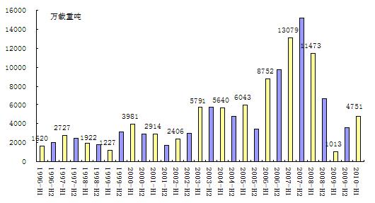 上半年新船成交量超預期。據(jù)英國克拉克松公司統(tǒng)計,2010年上半年全球累計成交新船624艘、4751萬載重噸,同比上升369%,其中,第二季度新船成交量明顯放大,月均成交量達1102萬載重噸,是第一季度平均單月成交量(482萬載重噸)的2.3倍,甚至超過2003-2006年興旺前期月均成交量水平。