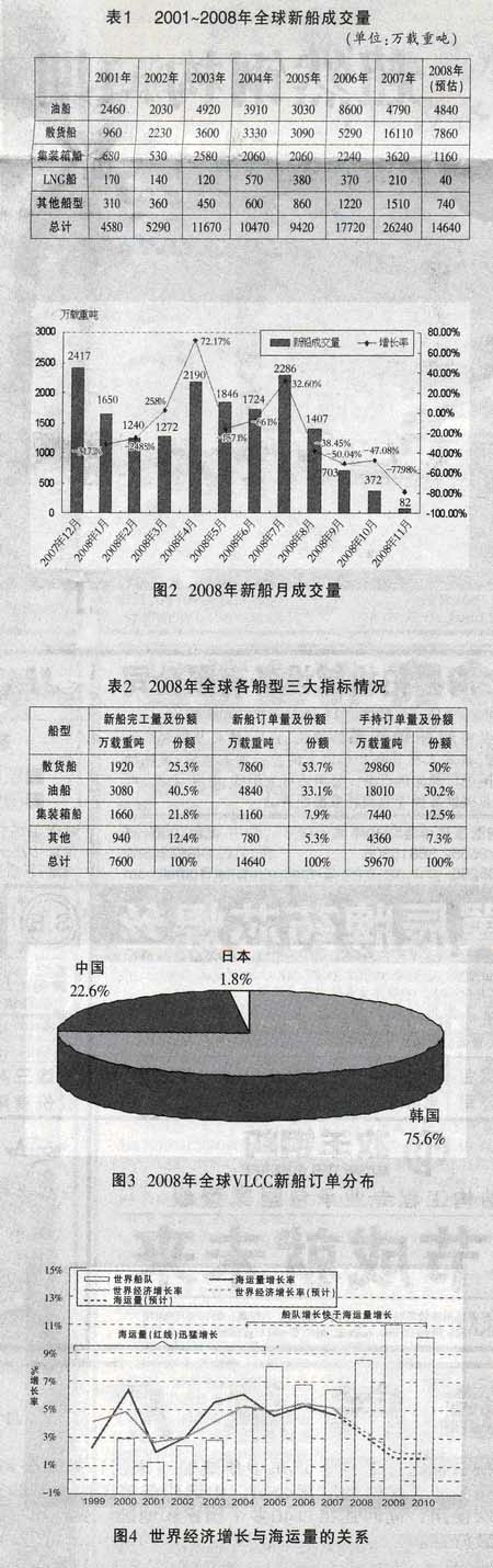 2008年,全球新船成交約2028艘、1.45億載重噸,以載重噸計,比2007年下降了44.6%,也明顯低于2006年的水平,但仍高于2000~2005年的年均成交量,在多重不利因素的相繼沖擊下,新船訂造市場交出這樣的成績單也算差強人意。但從單月的成交量看,整個市場逐月下滑的趨勢非常明顯。