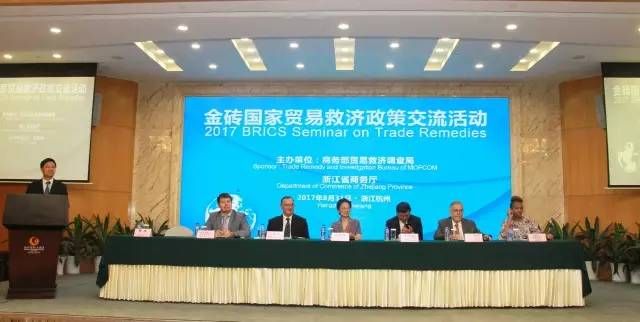 2017年8月31日上午“金磚國家貿(mào)易救濟政策交流活動會”在杭州浙江國際大酒店召開。商務(wù)部、商務(wù)廳、各地市商務(wù)局領(lǐng)導(dǎo)、律師專家及預(yù)警點的預(yù)警專員等120人出席了會議。浙江省分管商務(wù)工作的梁黎明副省長出席會議并作了熱情洋溢的致辭。商務(wù)部貿(mào)易救濟調(diào)查局王賀軍局長,介紹了全國“二反一?!钡男蝿荩部隙苏憬≡谫Q(mào)易救濟工作中作出的種種努力。尤其是出口預(yù)警示范點工作及“四體聯(lián)動”應(yīng)訴工作取得了好的成績。會議上半段,由省商務(wù)廳韓杰副廳長主持會議。舟山市出口船舶預(yù)警示范點、舟山市出口水產(chǎn) 警示范點預(yù)警專員參加了會議。
