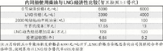 不同于歐洲內(nèi)河LNG動力船的發(fā)展,中國最早在內(nèi)河船使用LNG作為動力的嘗試來自商業(yè)嗅覺相對靈敏的民營能源企業(yè)。這些企業(yè)拿出資金對船東的內(nèi)河船進行LNG動力改造,又恰逢國家深入推進節(jié)能減排,得到一定的政府補貼。當(dāng)柴油與LNG的價格差達(dá)到2500元/噸時,使用LNG可為船東節(jié)約30%的燃料成本,按照當(dāng)時30萬~40萬元的改造成本,即便沒有政府補貼,3~4年也可通過燃料價格差收回改造成本,之后便可通過銷售LNG獲得利潤。但伴隨國家對LNG動力船標(biāo)準(zhǔn)規(guī)范的提高,改造費用增加到100萬元以上,同時柴油與LNG價格差越來越小,當(dāng)投資回收期超過8年,船東基本不會再考慮使用LNG做燃料(見表)。