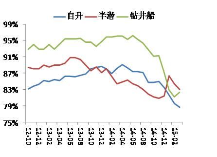 2)2015年以來海工裝備運(yùn)營市場持續(xù)惡化,主要海工裝備利用率和租金水平繼續(xù)下跌。