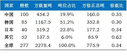 2)目前世界排名前十造船企業(yè)以韓日船廠為主,中國僅有大船重工一家船廠。