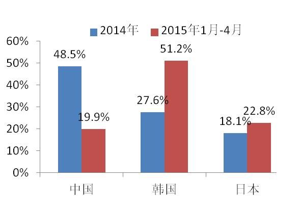 1)2015年1月-4月,中國、韓國和日本分別承接訂單454.2萬載重噸、1167.5萬載重噸和519.2萬載重噸,分別占全球份額19.9%、51.2%和22.8%,日韓市場份額較2014年明顯擴(kuò)大,中國市場份額明顯縮小。