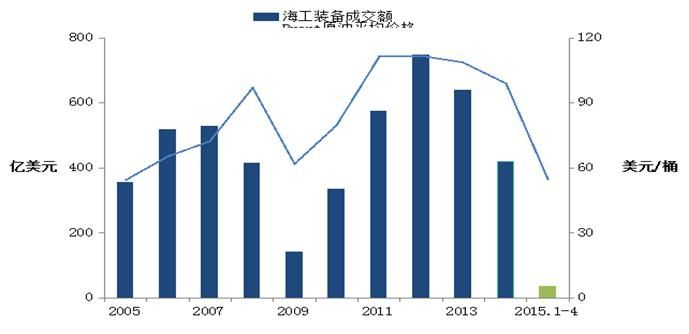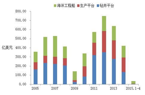 1)在預(yù)期油價(jià)維持低位、油公司大幅削減投資的背景下,2015年海工裝備市場成交額將大幅回落,按1-4月成交趨勢(shì)外推全年約為110億美元,即使考慮后期市場有所改善,預(yù)計(jì)全年也難以突破200億美元。