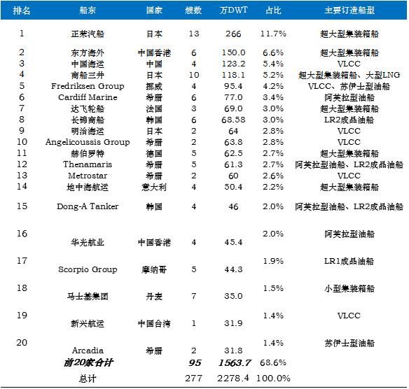 2)2015年1月-4月,全球訂造量前20名船東累計(jì)訂造1563.7萬載重噸,總量68.6%,較2014年22.3%水平迅速提升。10500TEU、18000TEU及20150TEU超大型集裝箱船、30.8萬噸VLCC等熱點(diǎn)船型的集中成交,是市場集中度迅速提升的主要原因。