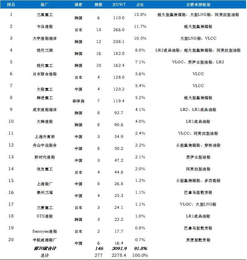 1)2015年1月-4月全球前20名船廠接單占比91.8%,遠(yuǎn)高于2014年60%的水平,集中度大幅提升。