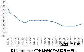 在新船成交量強(qiáng)勁回升的帶動(dòng)下,新船價(jià)格在經(jīng)歷了兩年多的持續(xù)走低后開始企穩(wěn)回升。2012年11月至2013年5月,克拉克松新船價(jià)格指數(shù)維持在126點(diǎn),2013年6月開始持續(xù)虧損。2013年12月,克拉克松新船價(jià)格指數(shù)上升至133點(diǎn),同比上漲5.6%。