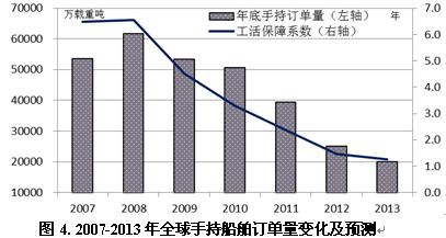 2013年度手持訂單量預(yù)測。按照上述預(yù)測,根據(jù)大致測算公司“期末手持訂單量=期初手持訂單量-期間造船完工量+期間新船訂單量-期間訂單撤銷量”,預(yù)計(jì)2012年底全球手持船舶訂單量降至2.5億載重噸,2013年可能進(jìn)一步跌破2億載重噸。全球造船業(yè)工活保障系數(shù)由2007年6.6年將跌至2012年底1.6年,2013年進(jìn)一步下滑至1.25年(以1.6億載重噸有效產(chǎn)能測算),預(yù)計(jì)2013年全球?qū)⒂懈嗟拇瑥S面臨無船開工的局面。