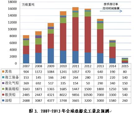 2013年度造船完工量預(yù)測。按手持訂單量交付和后續(xù)訂單交付期安排,同時考慮近幾年訂單未交付情況,預(yù)計(jì)2013年約為1.3億載重噸,較上一年下滑15%左右,2014年和2015年將進(jìn)一步下滑。2013年全球造船產(chǎn)能有效利用率加速下降基本上已成定局。