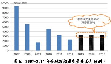 從新船需求來看,近幾年老舊船舶拆解強(qiáng)度顯著加大對“十二五”后三年行情會有很大促進(jìn)作用,預(yù)計(jì)2013-2015年期間年均需求預(yù)計(jì)約為3200萬修正總噸,其中,2013年成交量約為2960萬修正總噸,2014-2015年成交量有望進(jìn)一步放大到3500萬修正總噸左右。